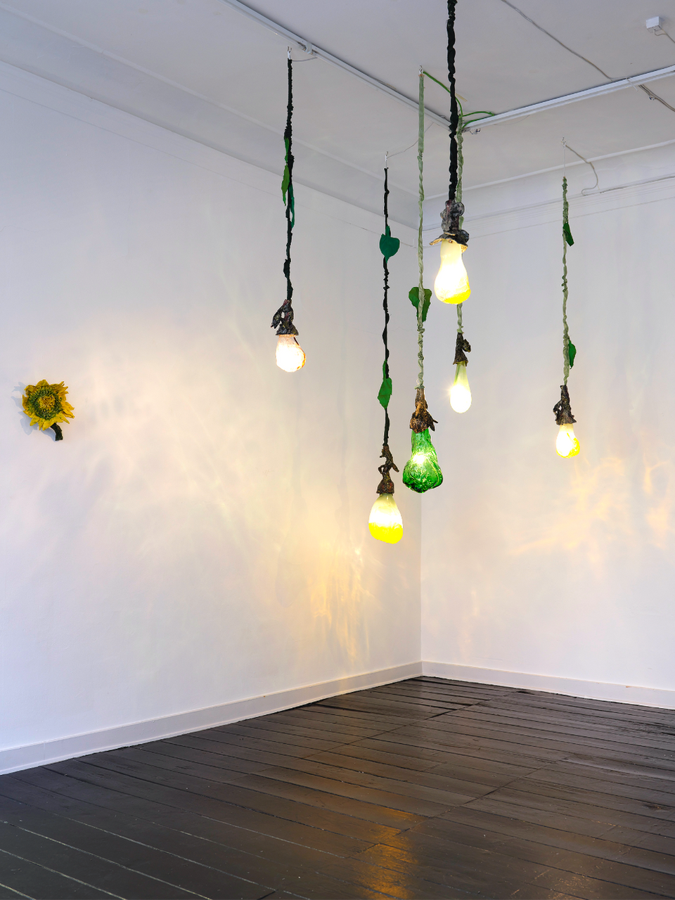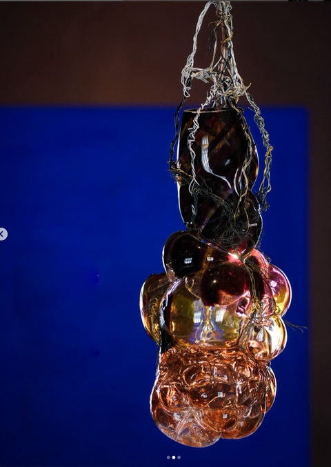 Handblown glass, wire, led light, textile, glazed ceramics.