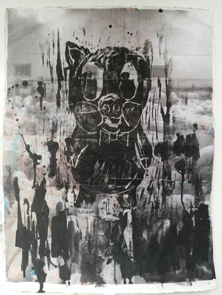 Mette Vangsgaard presents an exhibition of figurative works, all of which appear as part of a larger narrative about the world of dreams through Poliphilo’s journey. In two large works, Vangsgaard has combined the woodcut with the painting and textile on canvas in her characteristic collage technique. The two works presents us with a dark landscape that describes the night or the dream. In one of the works ’In the tall grass’ we meet a young man sleeping under a tree with long hangings branches.